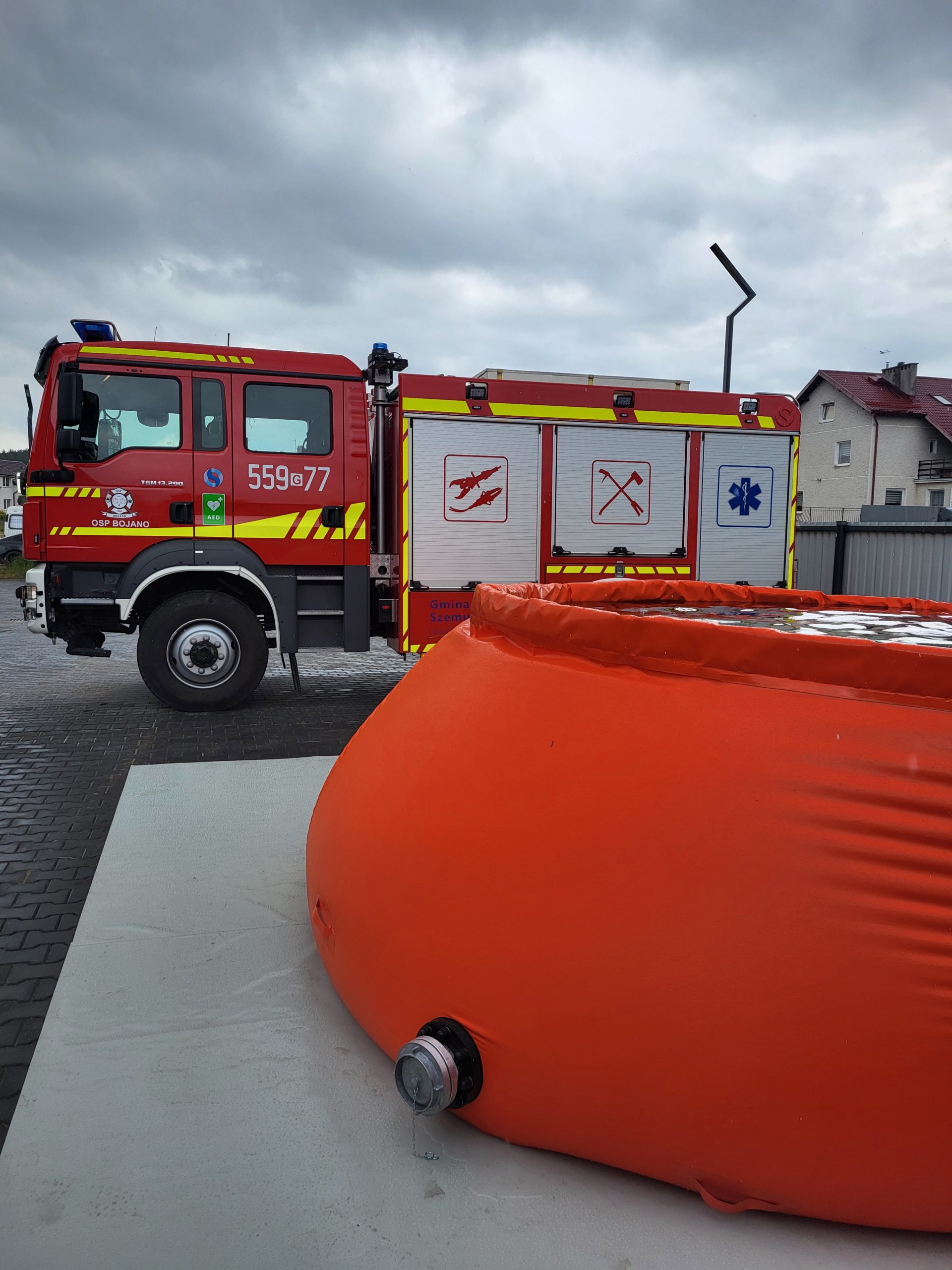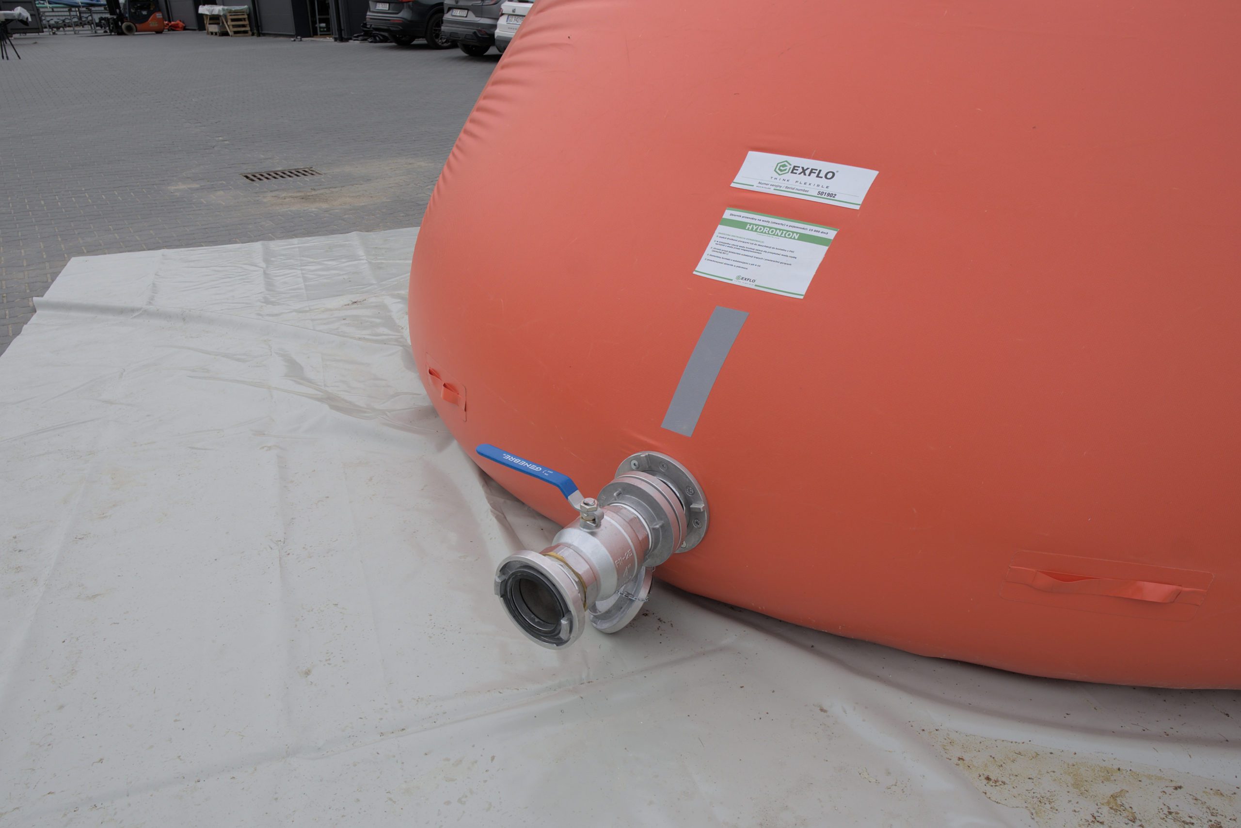 Its self-supporting flexible construction requires no permanent anchoring and no additional support frame, allowing the tank to be deployed quickly by simply unfolding and filling it with water. The open design supports fast filling and discharge, while the operational height in the filled state makes it suitable for efficient servicing of suspended helicopter fire buckets during wildfire and remote-area operations. Manufactured from durable PVC technical fabric and joined in critical areas by high-frequency (HF) welding, the tank is engineered for reliable performance in demanding field conditions. The material is protected with a special varnish that improves resistance to UV radiation, helping to extend service life during prolonged outdoor use. The unit is fitted with two flanged DN100 connections with Storz 110 couplings, enabling simultaneous filling and water discharge by multiple units. An integrated floating cushion also allows convenient top suction without significant water loss. The tank is approved for professional use and holds CNBOP approval certificate no. 5753/2025.
